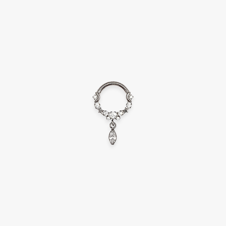 Adorn your piercings elegantly with the Bella Septum Piercing Hoop, featuring glittering cubic zirconias and a classic marquise dangle. Perfect for septums or cartilage, this gorgeous 18g (1mm) hoop adds a touch of timeless sparkle wherever you wear it.