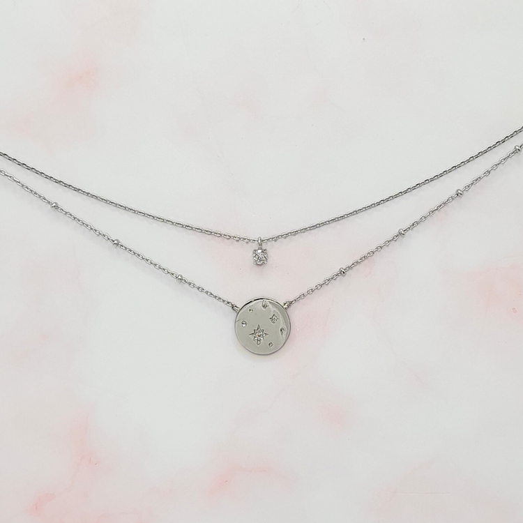 Dive into a cosmic charm with our Stardust Symphony necklace! The starry disc pendant, adorned with gems, harmonizes perfectly with a shorter, crystal-adorned chain. It's a celestial touch for your everyday style.