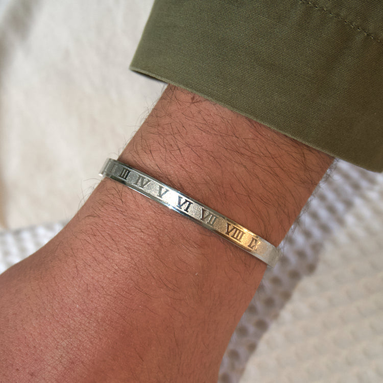 You'll be counting down the days after ordering the Roman Numeral Bangle, this 316 stainless steel bracelet will add a masculine flair to anyone's style, pair with the Roman Numeral Band Ring to rep the full look.